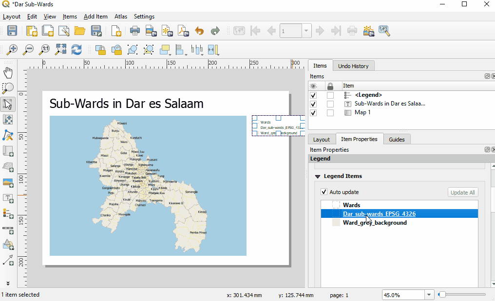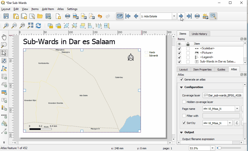- Para el Paso 1, seleccione las capas ‘Dar_wards_EPSG_4326 copy’, ‘Dar_sub-wards_EPSG_ 4326 copy’, y ‘Ward_grey_background copy’.’
