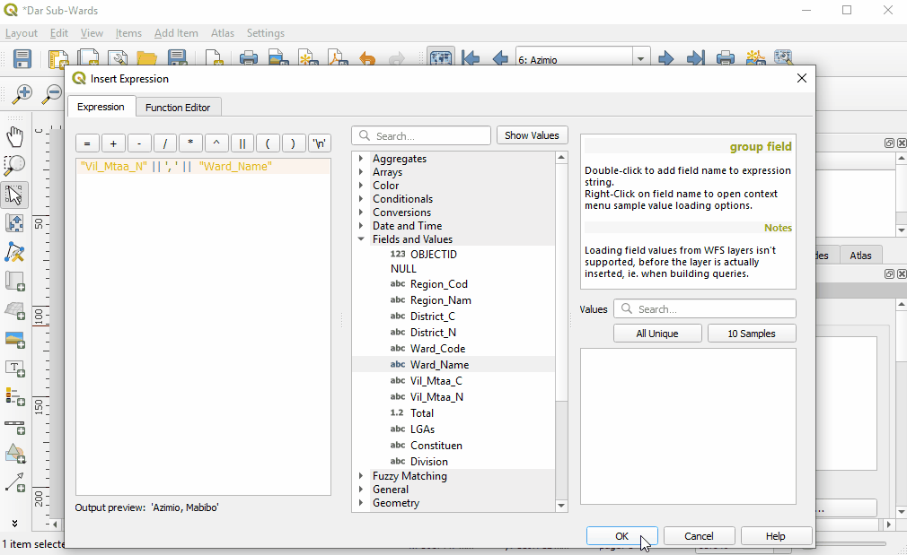 - Construya la expresión: “Distrito_N” || ‘’ || “Ward_Name” || ‘’ || “Vil_Mtaa_N”