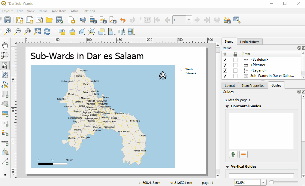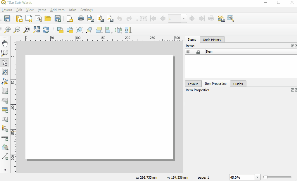 Abra el menú “Proyecto” de la barra de herramientas principal y seleccione “Nuevo diseño de impresión”. En la ventana emergente, cree un título para su mapa. Puede ser un nombre único que describa el propósito de su mapa, como “Dar Sub-Wards”. Se creará una nueva ventana con una página en blanco. Esto muestra cómo se verá su mapa impreso.