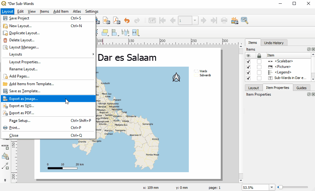 En esta fase, puede decidir si desea guardar el mapa como un mapa único o pasar a generar un atlas. Si desea guardar el mapa actual como un mapa independiente, abra el menú “Diseño” y seleccione una de las opciones “Exportar como…” en función de sus preferencias de archivo.
