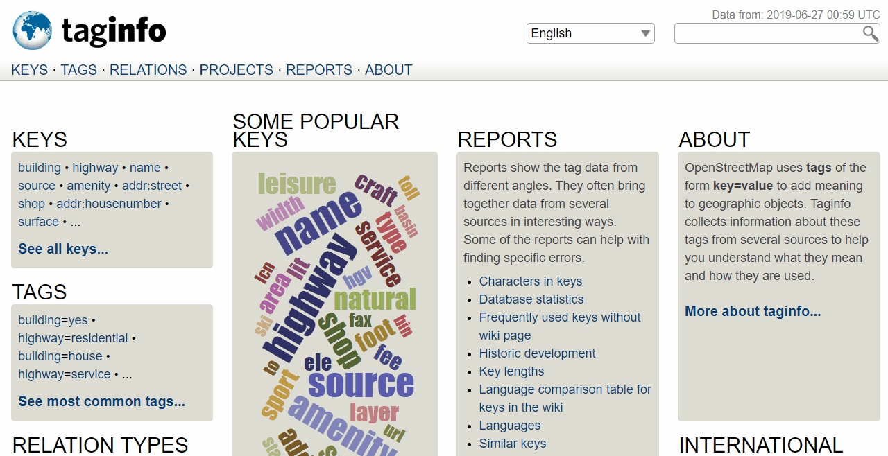 Taginfo est un système permettant de trouver et d’agréger des informations sur les balises OSM et de les rendre consultables.