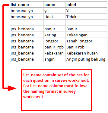 | For naming variable in list_name this must follow the naming provided in survey worksheet. For example on survey worksheet we enter a multiple choice type with the name select_one jns_bencana. So on the choices worksheet we must fill list_name with name jns_bencana. |