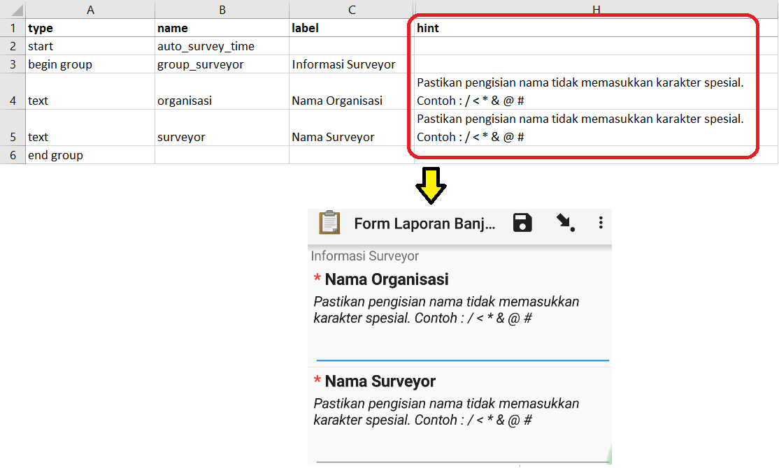 By using this feature, we can provide additional information or instructions on how to fill in a question that we make. To create this feature, we must add a new column in the survey worksheet called hint. By adding this column, for each type of question we make, we can add it with the information, such as instructions to filling the form, in column hint.